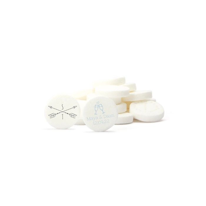 Deliciosas pastillas de menta suave y muy refrescantes con impresión de tu logo a una tinta, y sí, comestible! Puedes imprimir en azul, rojo o negro.